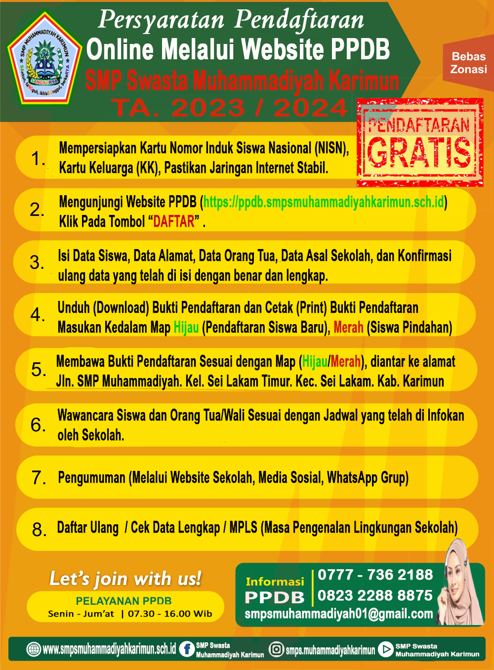 SMP SWASTA MUHAMMADIYAH KARIMUN menyediakan Website PPDB (Penerimaan Peserta Didik Baru / Siswa Baru) secara online diharapkan proses PPDB dapat berjalan cepat dan bisa dilakukan dimanapun dan kapanpun selama Pendaftaran dibuka. Proses pendaftaran calon siswa baru di masa pandemi Covid-19 ini dan terhambat oleh jarak jika datang ke Sekolah langsung, Calon siswa bisa mengakses website PPDB Online SMP SWASTA MUHAMMADIYAH KARIMUN.